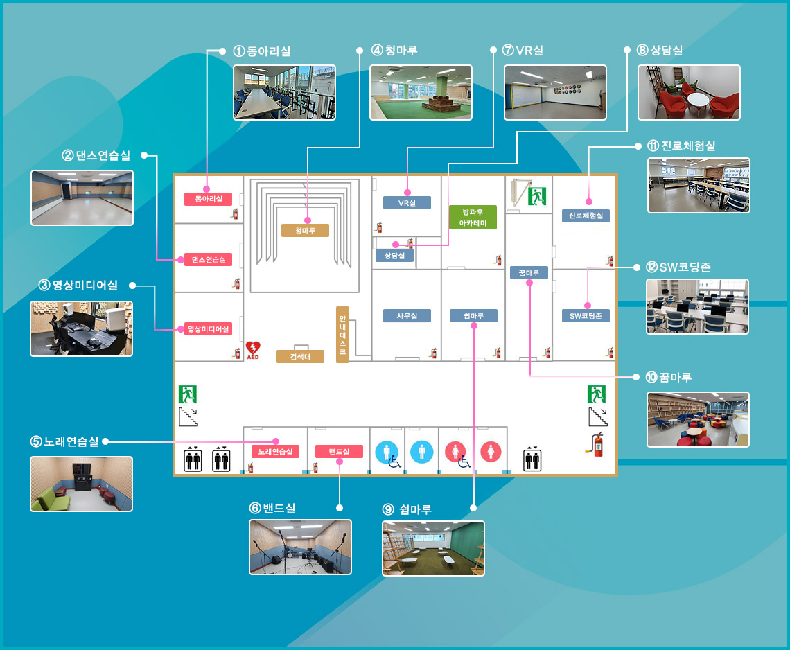 | ⑪ 진로체험실 | 다양한 창작활동을 통해 청소년의 꿈을 디자인할 수 있습니다. | 20명 |